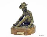 Physical DescriptionA bronze sculpture of a cowboy sitting down with his right hand resting on his right boot on a wooden base. On the base is a small engraved metal plaque, "'New' Western Man by Margaret Valpey."Additional Details
